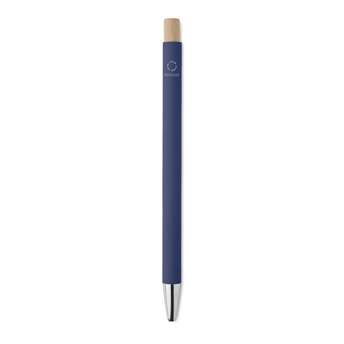 Gerecycled aluminium balpen met bamboe drukknop. Zilveren punt en clip. Blauwe inkt.