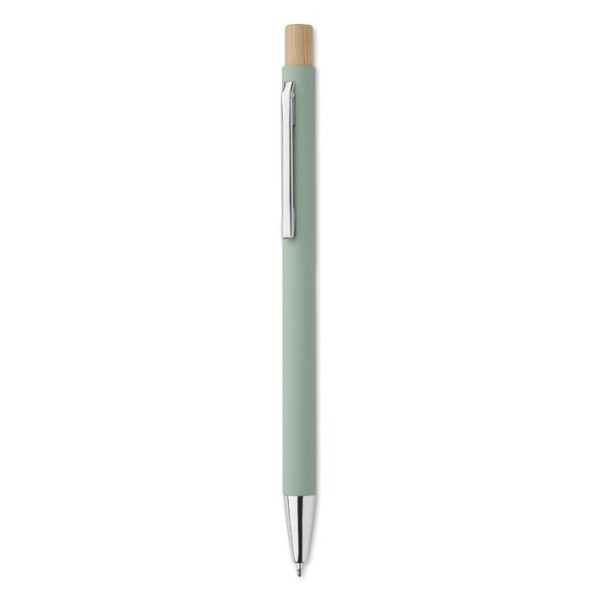 Gerecycled aluminium balpen met bamboe drukknop. Zilveren punt en clip. Blauwe inkt.