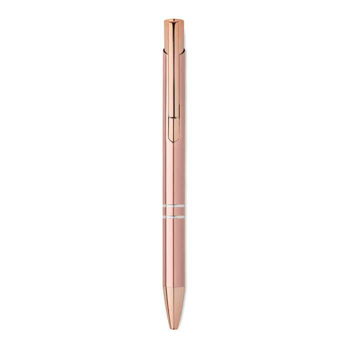 Pen met drukknop van gerecycled aluminium en roségouden details. Blauwe inkt.