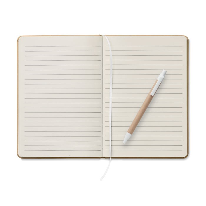 A5 notitieboek met harde gerecyclede kartonnen kaft. Ingebonden. 160 gelinieerde pagina's (80 vellen gerecycled papier). Elastische sluitingsband en pennenlus, bladwijzer met lint. Balpen met drukmechanisme en behuizing van gerecycled papier. Blauwe inkt.