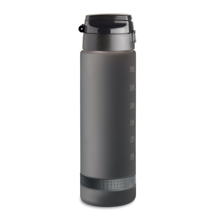 Sportwaterfles van RPET, motiverende tijdsaanduiding, met één hand te openen flip top deksel, veiligheidsslot en draagriem in de handgreep. Lekvrij. Inhoud: 1L.