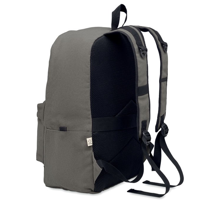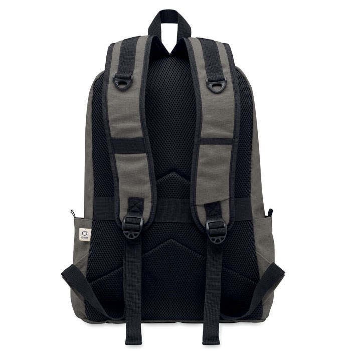 15 inch laptoprugzak van gerecycled pre-consumer katoen. Groot voorvak met rits en binnenvak voor laptop. Klein voorvak met rits. Twee zijvakken. Gewatteerde rug- en schouderbanden, rugpaneel en bodem. 450 gr/m².