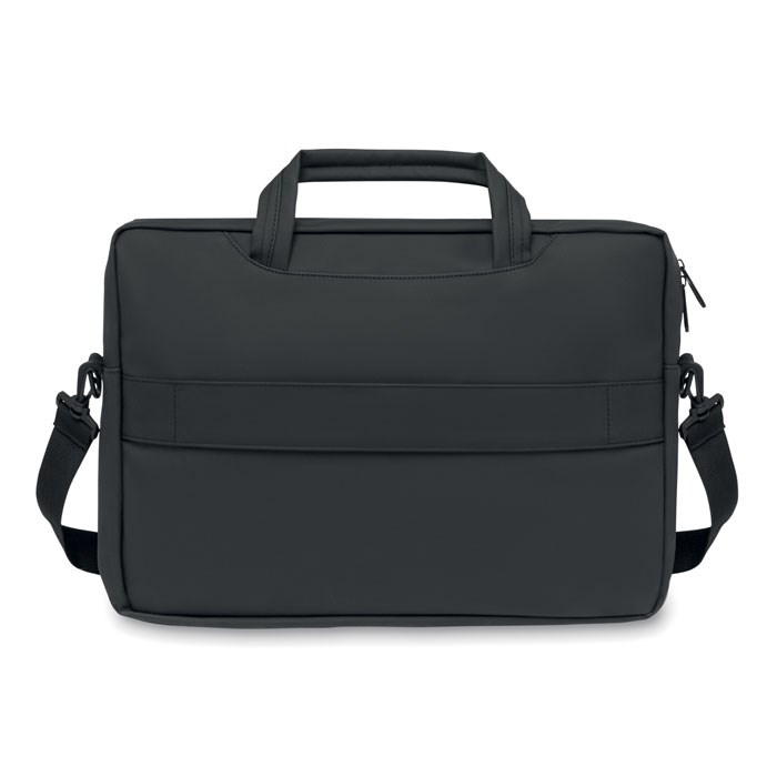 15 inch laptop documententas van zacht PU met gewatteerde achterkant. Eén gewatteerd hoofdvak voor de laptop en voorvak met rits en verschillende vakken. 210D RPET polyester voering. 2 handgrepen en een verstelbare en afneembare schouderriem met bescherming en trolleyhouder aan de achterzijde.