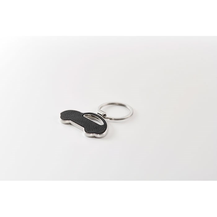 Metalen sleutelhanger in de vorm van een auto met inleg van gerecycled PU-leer.meer