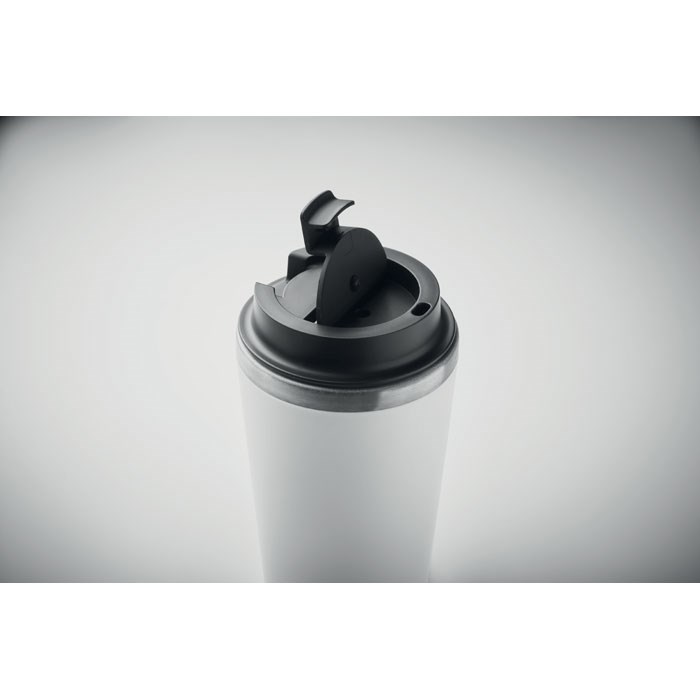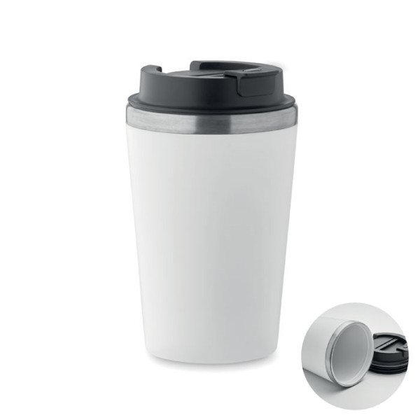 Dubbelwandige beker in PP buitenwand met binnenwand in gerecycled roestvrij staal (90% gerecycled roestvrij staal en 10% roestvrij staal) met een keramische binnenlaag. Lekvrij. Inhoud: 350ml.