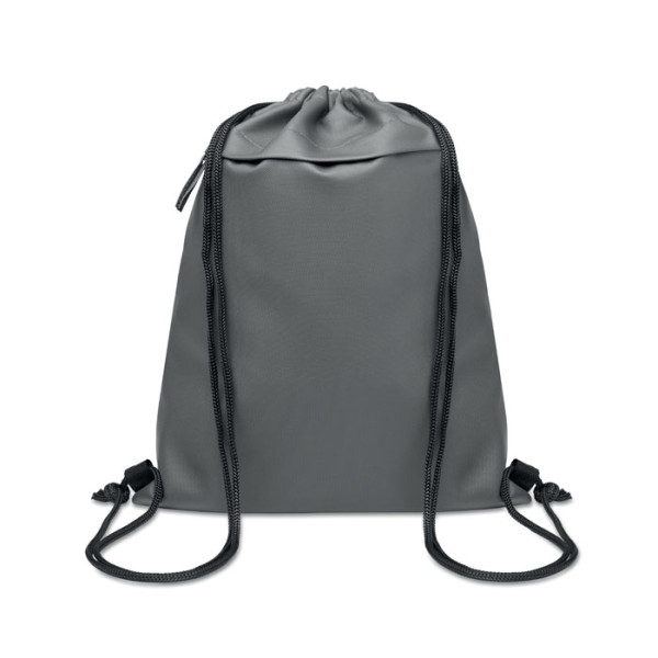 Trekkoordtas van PU-gecoat 600D RPET polyester en 190T RPET polyester voering. Voorvak met rits.