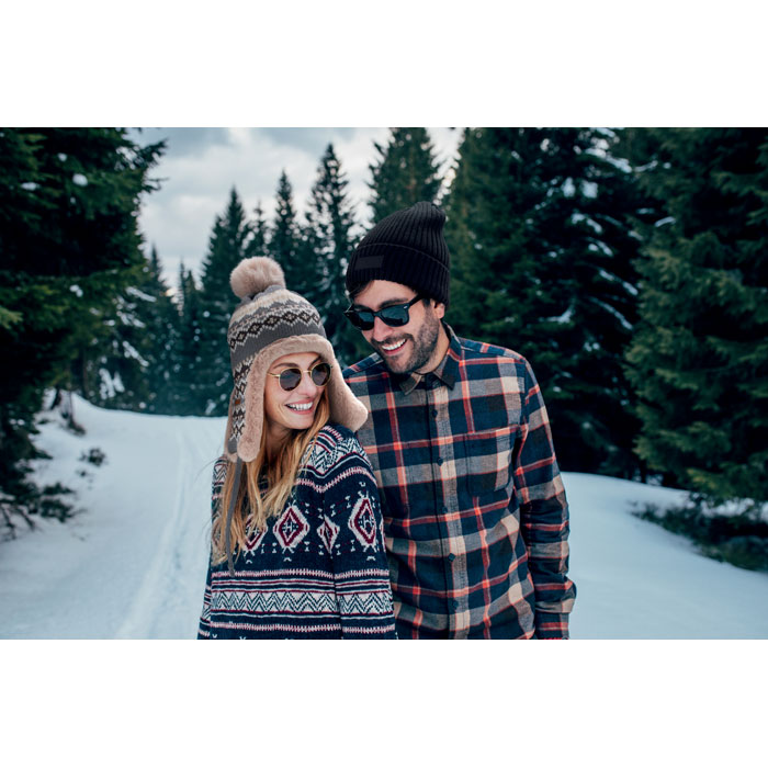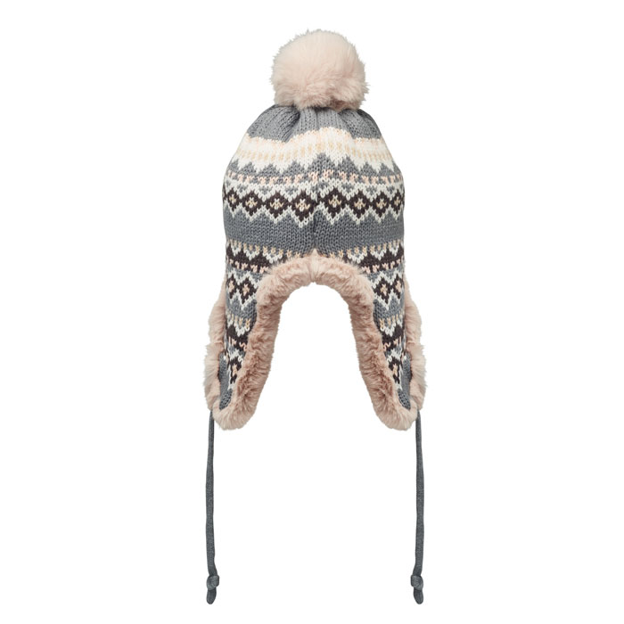 Gebreide muts met oorkleppen en pompon van acrylvezel met polyester en fleece voering. Inclusief label voor bedrukking aan één kant. Volwassen maat.