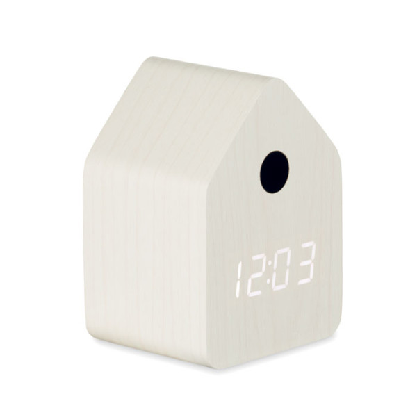 Kleine MDF-bureauklok met ingebouwde wekker met koekoeksvogelgeluid en temperatuurweergave. Het koekoeksgeluid klinkt elk uur en bij het afgaan van het alarm. Witte LED-display. Geluid wordt automatisch gedempt tussen 22.00 en 06.00 uur. Sluimerfunctie met intervallen van 5 minuten.