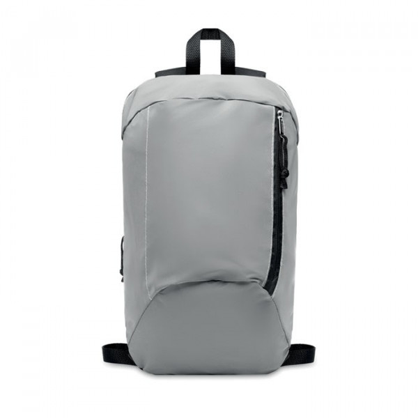 Rugzak van stevig 600D polyester met hoog reflecterend front voor extra zichtbaarheid, handig ritsvak en gewatteerde achterzijde voor extra draagcomfort.