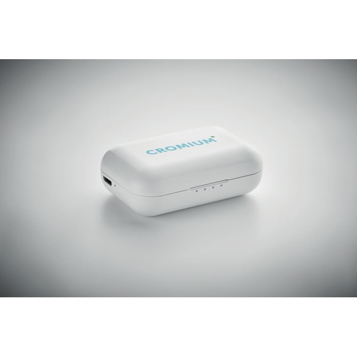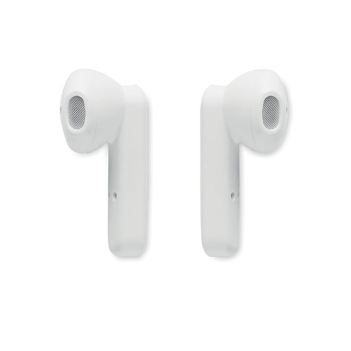 Set van 2 True Wireless Stereo (TWS) 5.3 oordopjes met microfoon en ingebouwde 30 mAh batterij. Speeltijd ca. 3 uur. Automatisch koppelen. Inclusief een micro USB oplaad kabel en een 185 mAh laadstation. Gemaakt van gerecycled ABS.