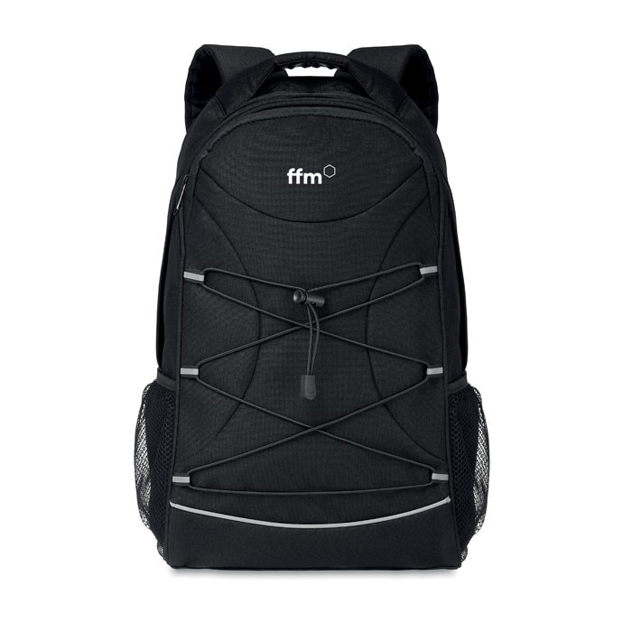 Rugzak van 600D RPET met donker koord voor op de rugzak en een reflecterend paneel voor betere zichtbaarheid in het donker. Mesh zakken aan beide zijden van de rugzak.