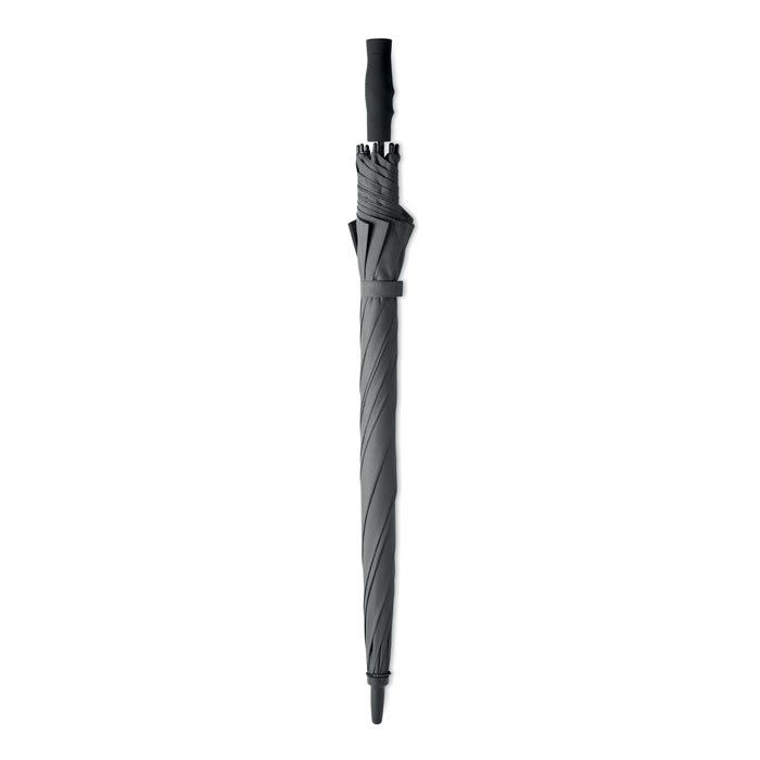 27 Inch windbestendige paraplu met 190T pongee doek, fiberglas stok en baleinen. Met zwart kunststof tips en top, recht handvat van rubberized ABS. Opent automatisch en sluit handmatig.