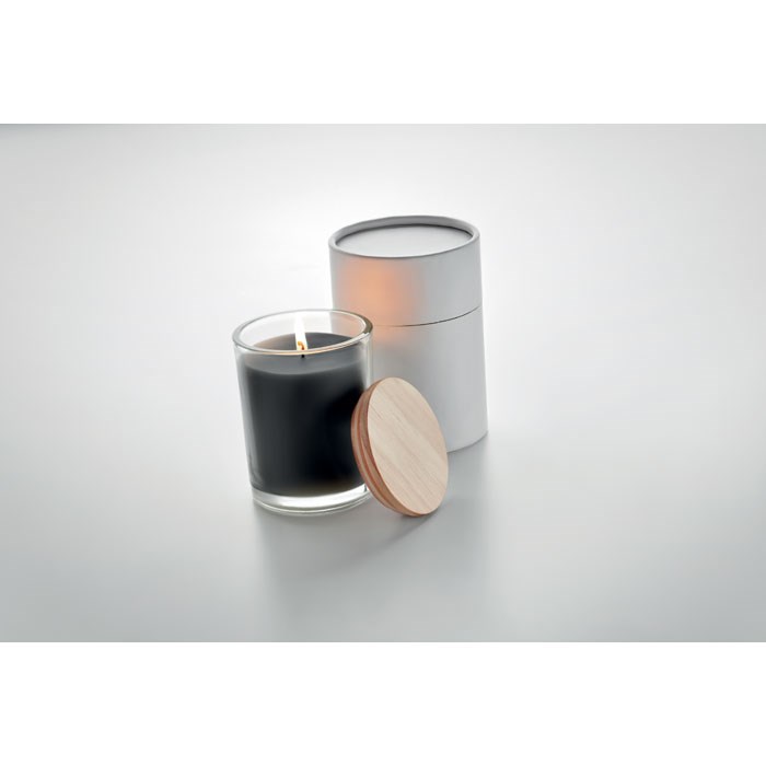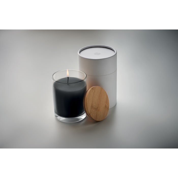Vanillegeurende plantaardige waskaars in glas met bamboe deksel, verpakt in een papieren...meer