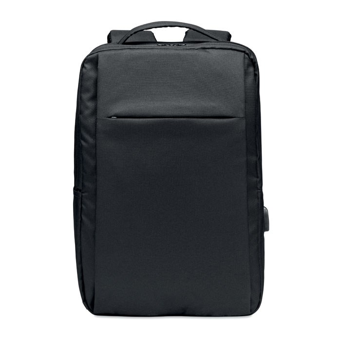 300D RPET polyester laptop rugzak met gewatteerde schouderbanden, een groot hoofdvak geschikt voor 15 inch laptops en een USB oplaadkabel.