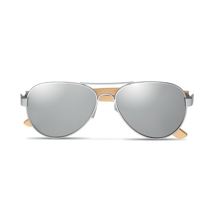 Zonnebril met bamboe pootjes en gekleurde spiegelende lenzen met UV400 protectie in microvezel brillenzakje. Bamboe is een natuurlijk product, de kleur per artikel kan verschillen.
