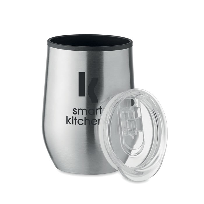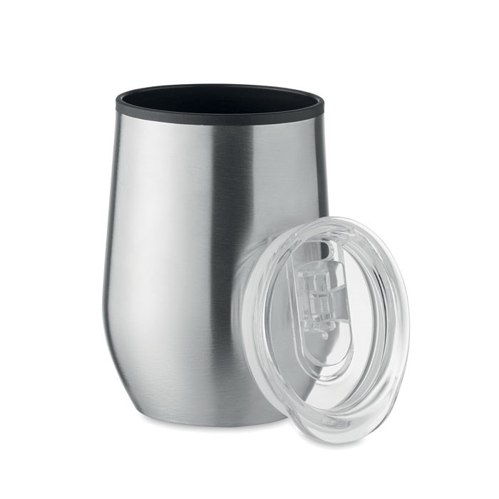 Dubbelwandige roestvrijstalen beker met PP binnenzijde en transparant PS deksel. Inhoud: 350 ml.meer