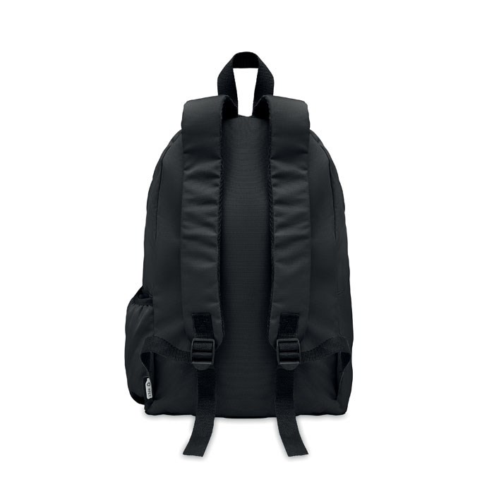 Rugzak in 600D RPET polyester met buitenvak met rits. Gewatteerde rug en een flessencompartiment aan de zijkant.