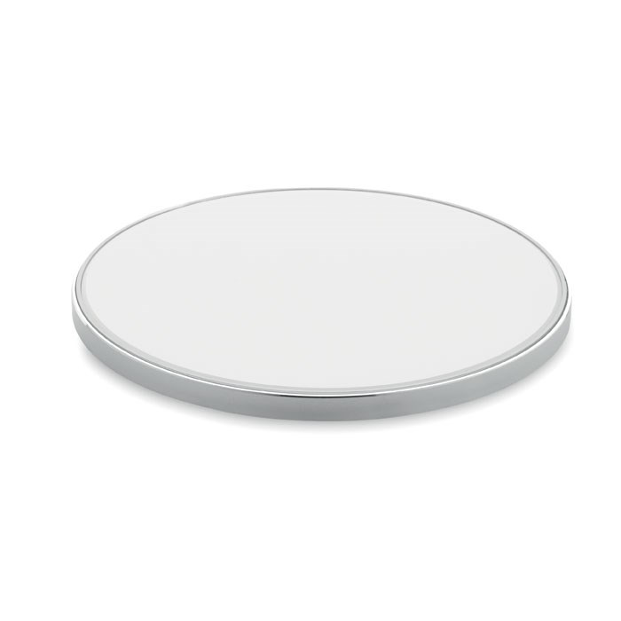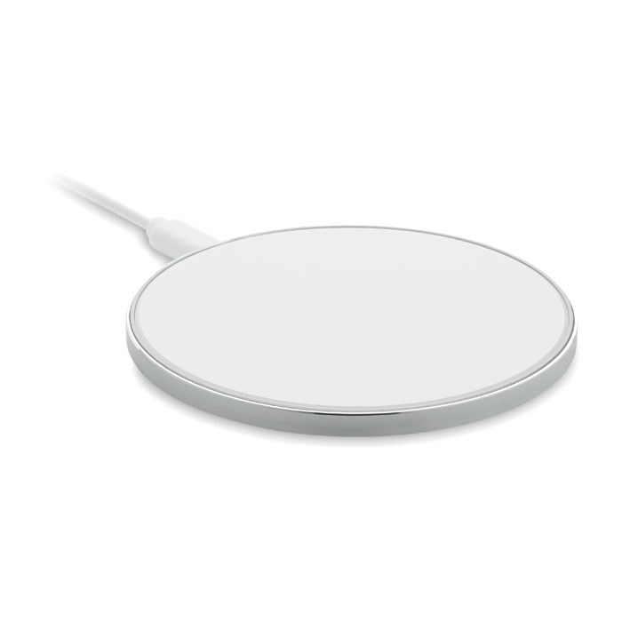 Aluminium draadloze oplader 10W met glas aan de bovenkant. Sluit apparaat aan op computer, leg smartphone erop en laat opladen. Blauw licht tijdens het opladen. Uitgang: DC 9V/1.1A.