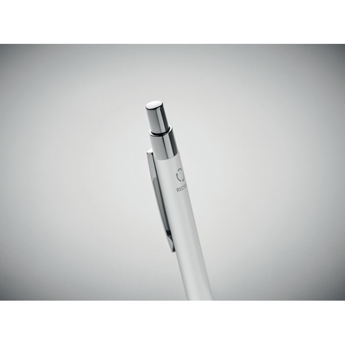 Balpen met drukknop in gerecycled aluminium. Blauwe inkt.meer