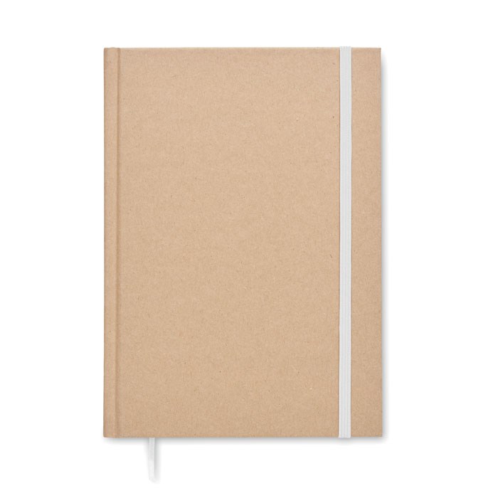 A5 notitieboek met harde gerecyclede kartonnen omslag. Kaft gebonden. 200 pagina's gelinieerd gerecycled papier (100 vel/80 grams). Elastische sluitingsband en leeslint. Gemaakt in de EU.