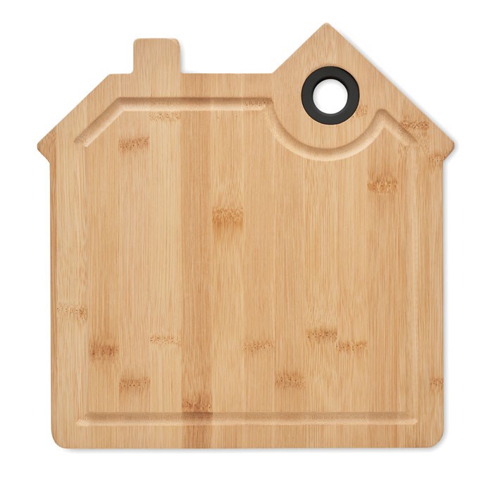 Huisvormige snijplank in bamboe met groef en opening om op te hangen. Bamboe is een natuurlijk...meer