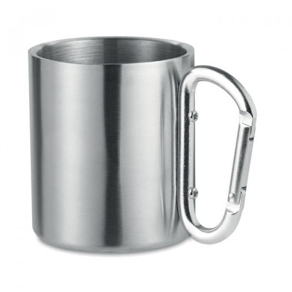 Dubbelwandige, roestvrijstalen mok met een karabijnhaak als handvat. Inhoud: 220 ml.
