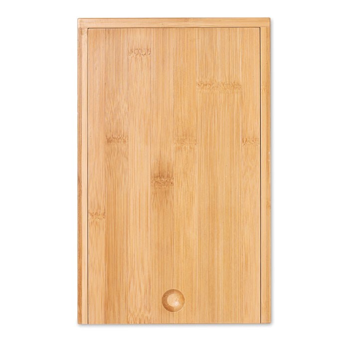 Bamboe kaas- en wijnset met een roestvrijstalen mes, kaas schilmesje, flessenopener en wijnstop. Gepresenteerd in een bamboe doosje. Bamboe is een natuurlijk product, de kleur per artikel kan verschillen.