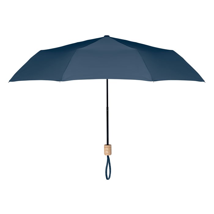 21 Inch paraplu van 190T RPET pongee met zwart metalen frame en baleinen. Houten handvat. In 3 delen opvouwbaar. Inclusief bijpassend hoesje. Opent en sluit handmatig.