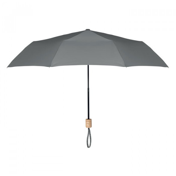 21 Inch paraplu van 190T RPET pongee met zwart metalen frame en baleinen. Houten handvat. In 3 delen opvouwbaar. Inclusief bijpassend hoesje. Opent en sluit handmatig.
