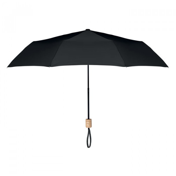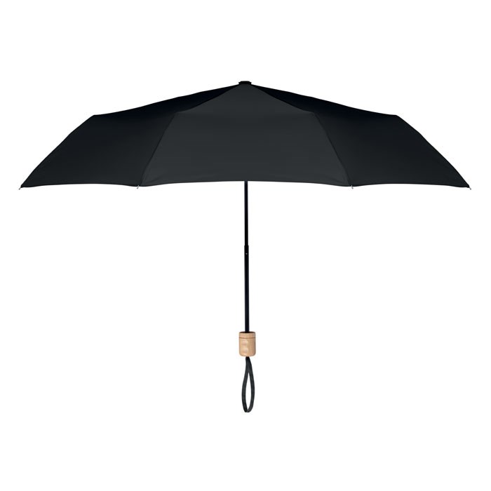 21 Inch paraplu van 190T RPET pongee met zwart metalen frame en baleinen. Houten handvat. In 3 delen opvouwbaar. Inclusief bijpassend hoesje. Opent en sluit handmatig.