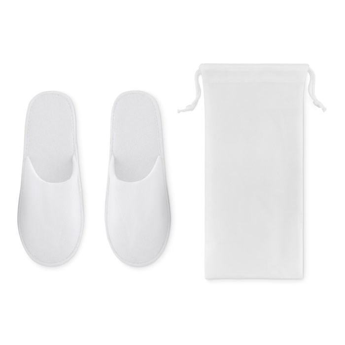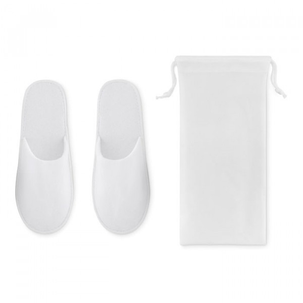 Twee polyester hotelslippers in een non woven pouch. Maat EUR 43 - 44.