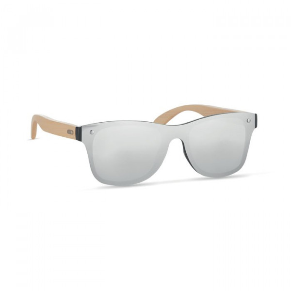 Zonnebril met een all-over spiegelglas en bamboe pootjes. Met UV400 protectie. Bamboe is een natuurlijk materiaal, waardoor kleur per item kan verschillen.