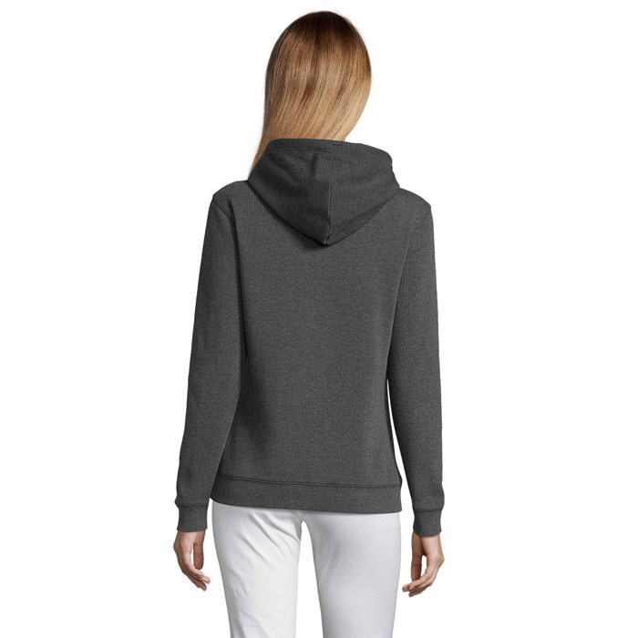 SOL'S SPENCER dames sweater 280g. Buidelzak. Gesneden en gestikt. Gevoerde capuchon met trekkoord. 2x2 geribde manchetten en boord. Halve maan binnenzijde kraag. Schouder tot schouder nekband. Materiaal: 80% rondgebreid katoen - 20% polyester. Geborstelde voering. Buitenkant: 100% katoen. OEKO-TEX®. Alleen verkocht inclusief bedrukking.