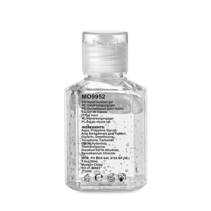 Handreinigingsgel (alcoholvrij) in PET-fles met afsluitbare dop. Inhoud 30 ml. Dit artikel is geclassificeerd als een cosmetisch product.
