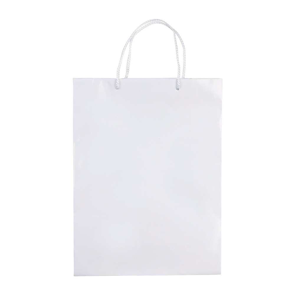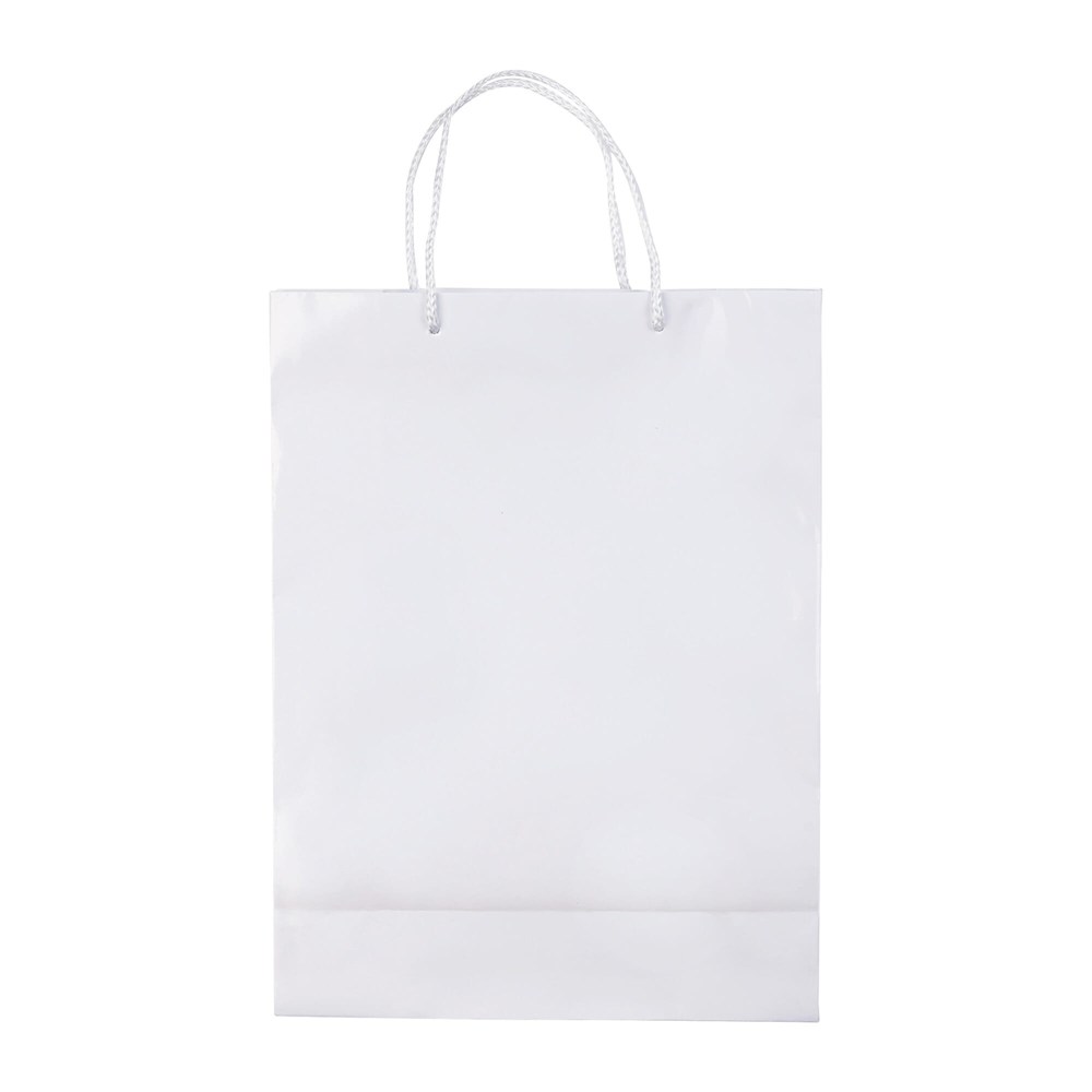 Grote papieren tas met hengels van gevlochten touw in wit en zwart. Groot drukoppervlak aan beide zijden. Stevige tas. Glossy gelamineerd.