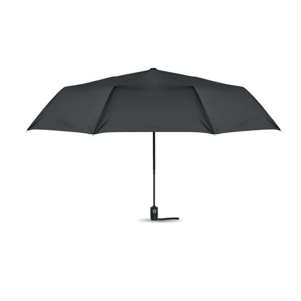 Windbestendige 27 inch 3-voudig automatisch openende/sluitende paraplu. 190T pongee materiaal, zwart beplaate stalen steel. Glasvezel baleinen, zwart beplaat binnen frame. Zwart PP handvat met knop. Met bijpassende tas.