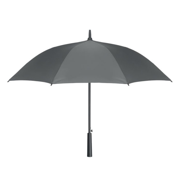 23 inch automatisch openende windbestendige paraplu van 190T pongee met glasvezel frame en zwart beplate metalen steel en kunststof uiteinden. ABS handvat met rubberen afwerking. Handmatige sluiting.