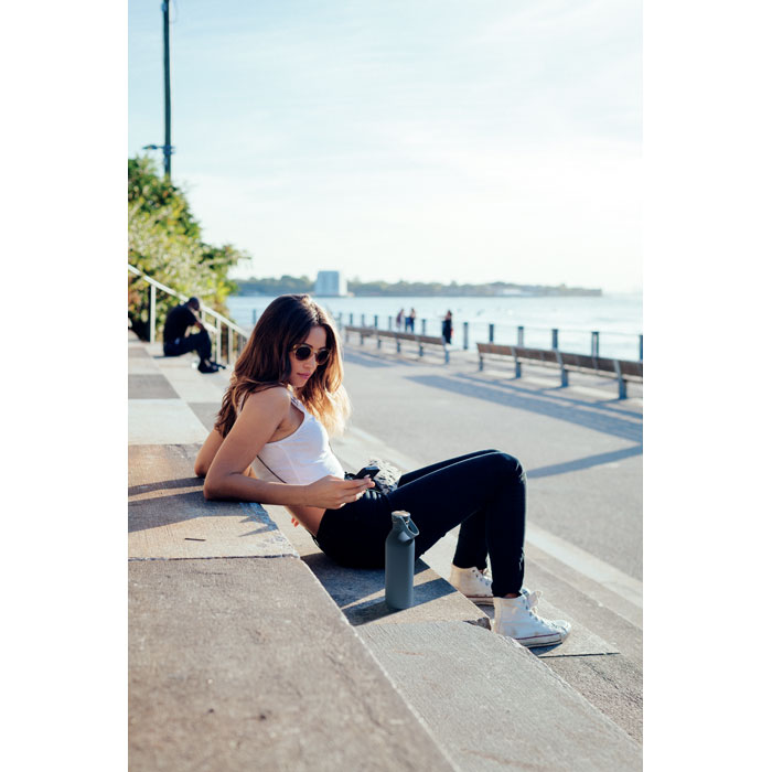 Enkelwandige fles van 90% gerecycled RVS en 10% RVS met rubberafwerking. Inclusief PP/RVS deksel en siliconen handvat. Inhoud: 500ml. Omdat dit een enkelwandige fles is kan warmte worden overgedragen