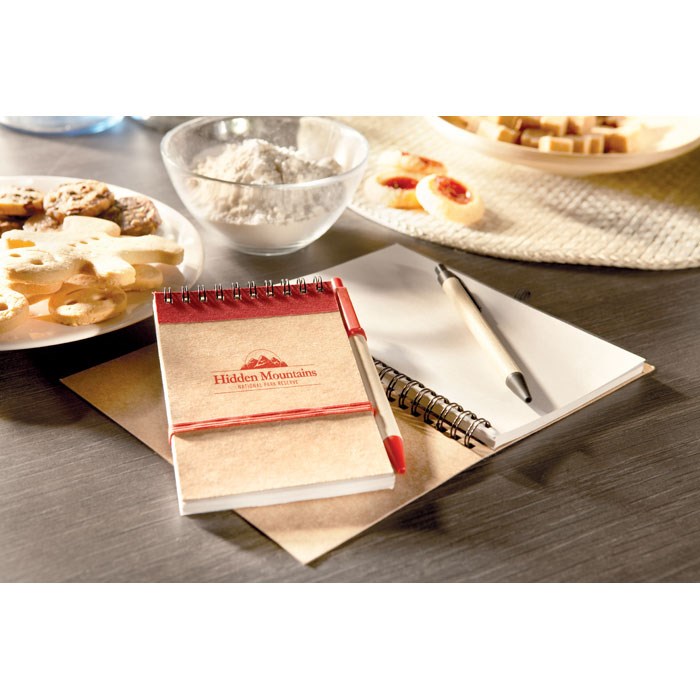 Notitieblok met 140 blanco pagina's (70 vellen) gerecycled papier, inclusief biologisch afbreekbare en gerecyclede balpen. Met elastieke sluiting. Blauwe inkt. FSC®-certified | FSC MIX, P7.1, FSC-C213206