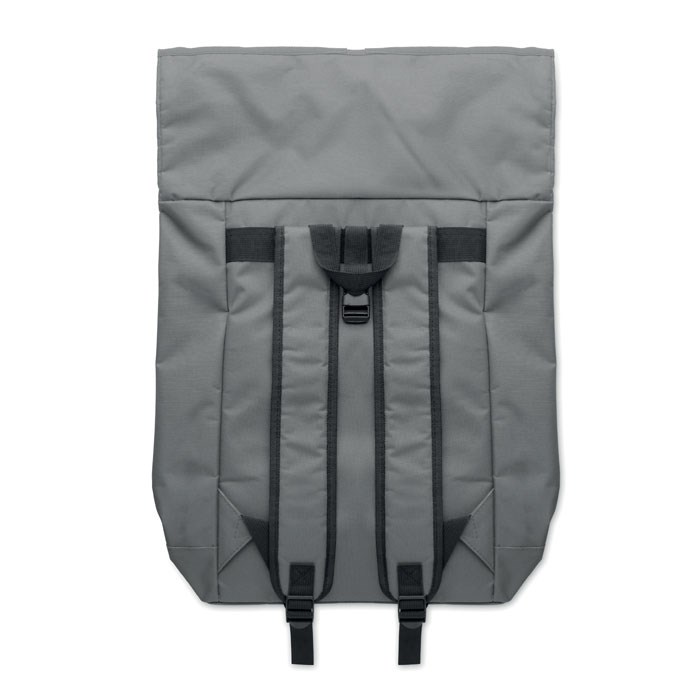 15 inch rolltop laptoprugzak van 600D polyester met gewatteerde achterkant en versterkte bodem. Afsluitbaar voorvak met rits. 210D voering.