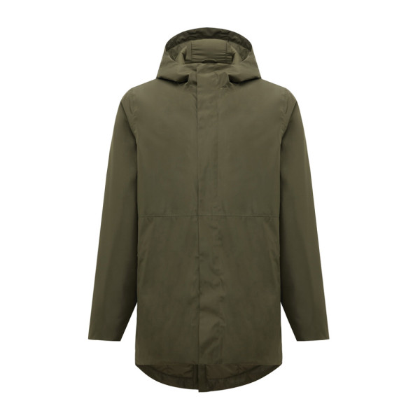 Unisex gewatteerde waterdichte parka van 100% gerecycled polyester. 4.000 mm waterdicht, ademend en windbestendig. Alle kenmerken van een klassieke parka: langere ruglengte, split achter, 2-weg rits, afgedekt door extra overslag met drukknopen, strakke mouwboorden met een extra binnenboord en capuchon met stoppers aan de binnenkant van de kraag. Gewatteerd met 100% r-polyester vulling en gevoerd met fijne taf. Aan de binnenkant onder zit een verborgen rits en links op de borst is plaats voor een decoratie. Het hele kledingstuk is gestikt met r-polyester naaigaren. Aan de achterkant van de nek zit een afscheurbaar maatlabel met een IQONIQ craft hangtag, aan de linker binnenkant van de zijnaad zit het waslabel. Het gebruik van echt gerecycled materiaal en de claims met betrekking tot de milieu-impact worden gegarandeerd door het gebruik van de AWARE™ disruptieve fysieke tracer en blockchain-technologie. Door de QR-code te scannen, krijgt u toegang tot een speciaal digitaal paspoort.