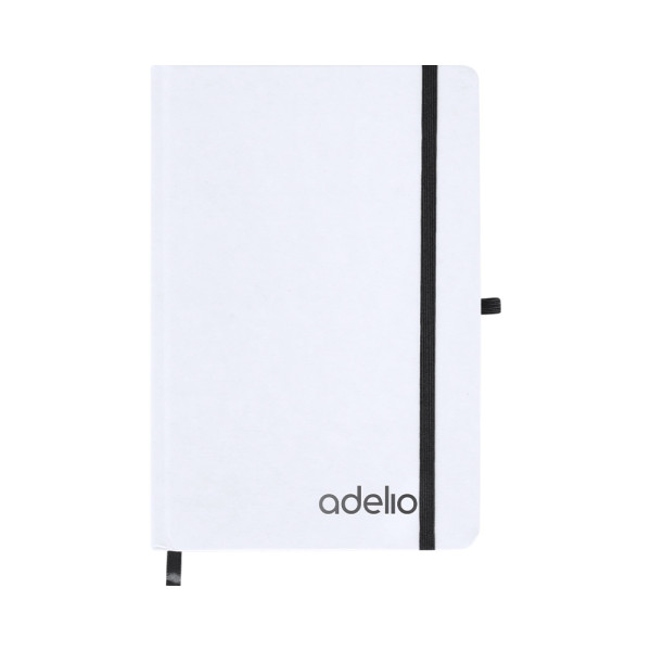 Notitieblok met stijve witte kaften gemaakt van gerecycled karton. Interieur met 80 vellen beschikbaar voor een streep. Inclusief bladwijzer, in dezelfde kleur als elastisch sluittape en penhouder. Speciaal voor lasergraveren met de geselecteerde kleur.