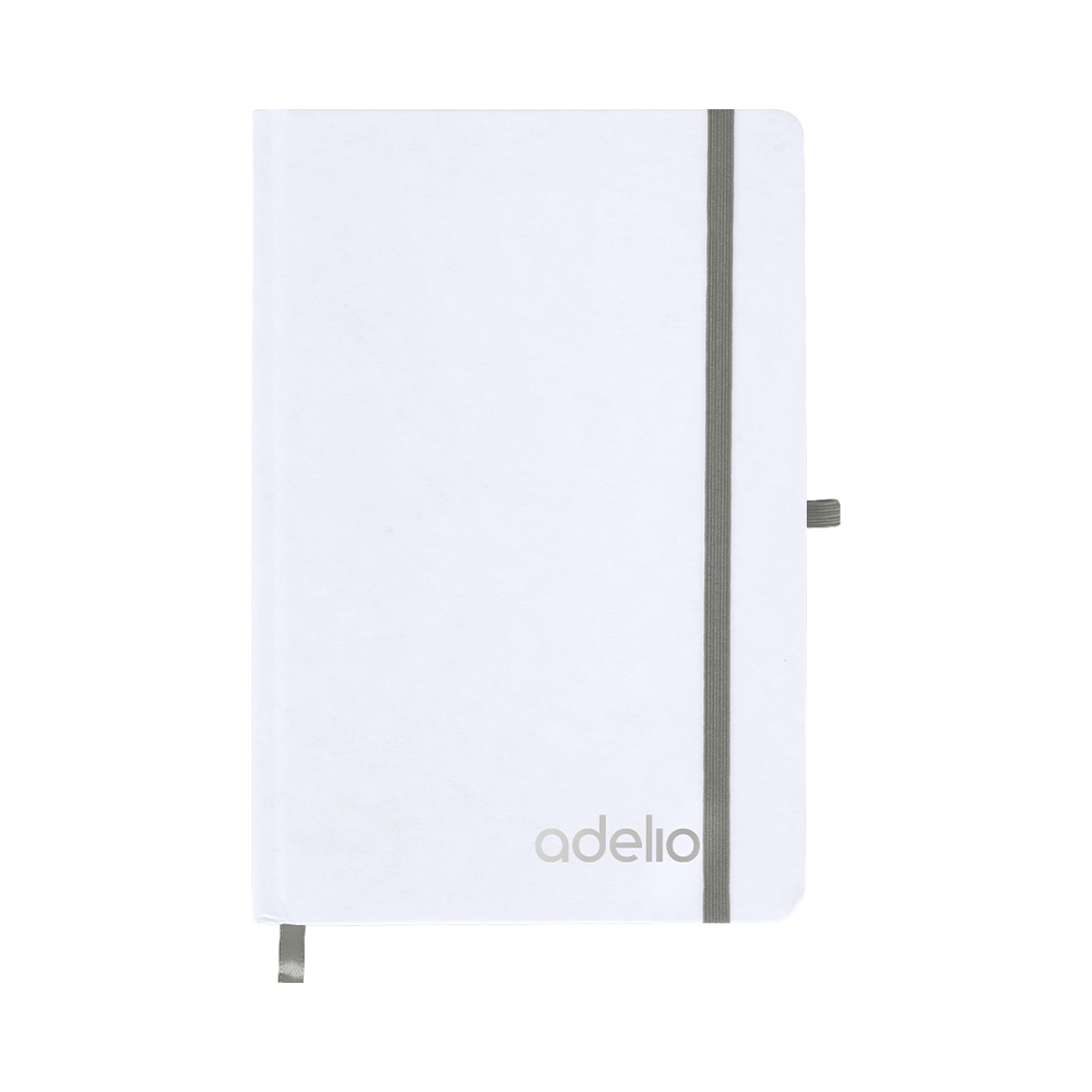 Notitieblok met stijve witte kaften gemaakt van gerecycled karton. Interieur met 80 vellen beschikbaar voor een streep. Inclusief bladwijzer, in dezelfde kleur als elastisch sluittape en penhouder. Speciaal voor lasergraveren met de geselecteerde kleur.