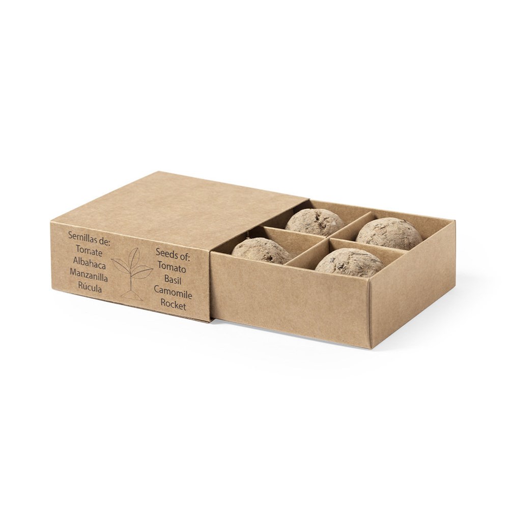 Groentetuinset met tomaten-, basilicum-, rucola- en kamillezaad. Gepresenteerd in een gerecycled kartonnen doos met plantinstructies, Made in Europe embleem en met 4 onafhankelijke compartimenten.
